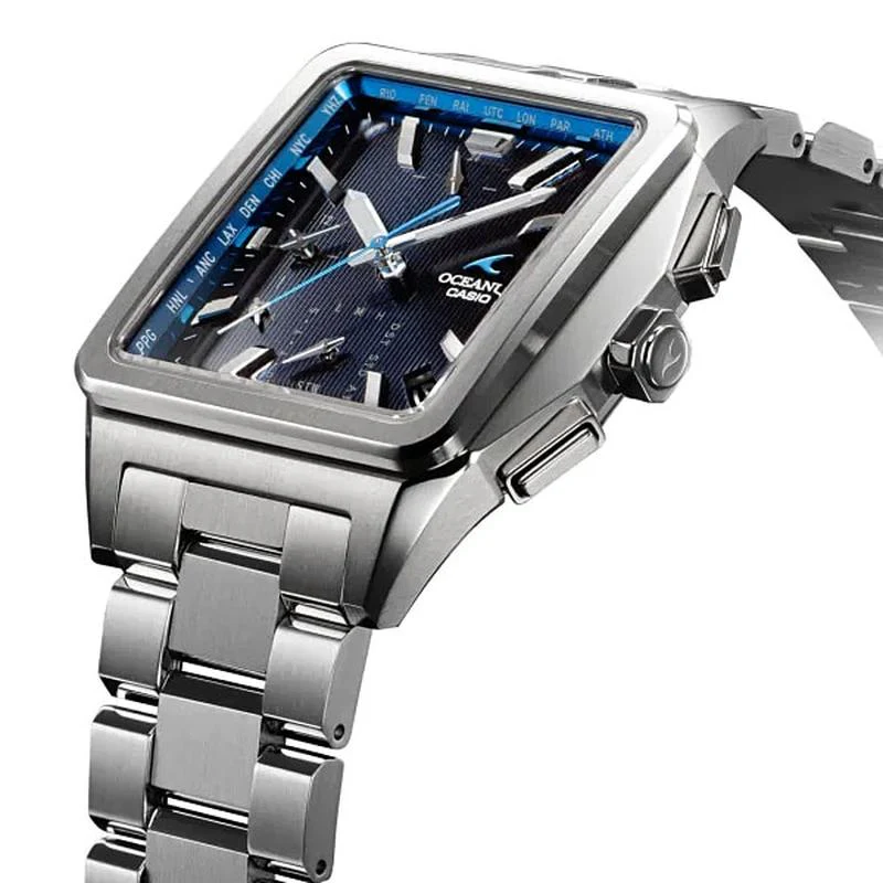 | The OCW-T5000 is a solid radio solar model with a distinctive square case. Its design features a smooth form with meticulously polished surfaces to enhance texture. The simple dial design highlights the quality of the case and band, incorporating the brand's signature blue color. The dial features a dark blue coating and subtle vertical stripe pattern. In terms of functionality, it offers time correction through standard radio wave reception and Bluetooth-enabled smartphone link. By connecting to your smartphone, the watch automatically adjusts the time, ensuring precise timekeeping globally. The smartphone link function allows easy setting of world time from approximately 300 cities, adapting to time zone and daylight saving changes effortlessly. Perfect for travelers, it also enables monitoring of battery level and hands adjustment via smartphone, utilizing digital technology to manage the watch's condition. Additionally, it features a dual dial world time display, showcasing two city times simultaneously. Meticulously crafted with Zaratsu polishing and titanium carbide processing for enhanced durability, the OCEANUS OCW-T5000 is an elegant timepiece suitable for any occasion. | |